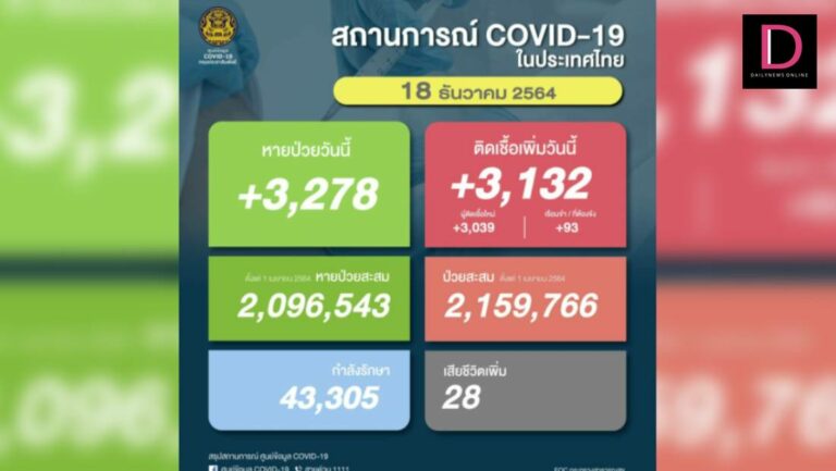 สถานการณ์แพร่ระบาดของโรคโควิด-19 ประจำวัน ศูนย์บริหารสถานการณ์การแพร่ระบาดของโรคติดเชื้อไวรัสโคโรนา 2019 (ศบค.) รายงานสถานการณ์การระบาดของไวรัสโคโรนา 2019 ล่าสุด วันที่ 18 ธ.ค. 64 พบผู้ติดเชื้อโควิด-19 รายใหม่อีก 3,132 ราย เป็นผู้ติดเชื้อใหม่ 3,039 ราย และผู้ติดเชื้อในเรือนจำ 93 ราย ทำให้มียอดผู้ป่วยยืนยันสะสมตั้งแต่ 1 เมษายน 2564 มีจำนวน 2,159,766 ราย หายป่วยกลับบ้าน 3,278 ราย หายป่วยสะสม 2,096,543 ราย กำลังรักษา 43,305 ราย