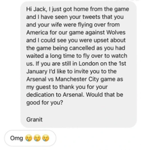 อย่างไรก็ตาม โรบินสัน ยังไม่โชคร้ายไปเสียทั้งหมด เมื่อ ชากา เห็นโพสต์ดังกล่าว จึงส่งข้อความส่วนตัวไปหาทั้งคู่ เพื่อเชิญมาชมเกมปะทะ “เรือใบสีฟ้า” ในวันที่ 1 ม.ค. นี้ โดยระบุว่า “สวัสดี แจ๊ค ผมเพิ่งกลับมาถึงบ้านหลังเสร็จสิ้นภารกิจจากเกมกับ นอริช และได้เห็นทวิตของคุณ ว่าคุณกับภรรยา กำลังจะบินมาจากอเมริกาเพื่อดูเกมที่เราจะเจอกับ วูล์ฟส์ ผมเห็นได้เลยว่าคุณผิดหวังที่เกมต้องถูกเลื่อน แต่ถ้าถึงวันที่ 1 ม.ค. คุณยังอยู่ในลอนดอน ผมอยากเชิญคุณมาชมเกมที่ อาร์เซนอล จะเจอกับ แมนเชสเตอร์ ซิตี ในฐานะแขกของผม เพื่อขอบคุณที่คุณทุ่มเทเพื่ออาร์เซนอล มันน่าจะดีนะ? จาก กรานิต”