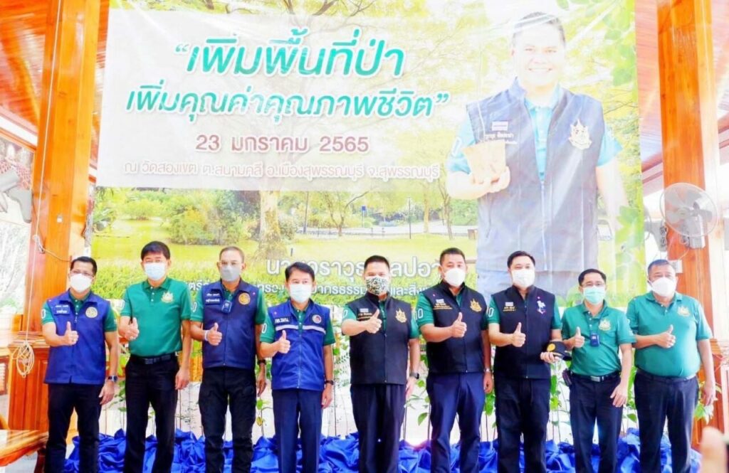 เมื่อเวลา 09.00 น. วันที่ 23 ม.ค. นายวราวุธ ศิลปอาชา รมว.ทรัพยากรธรรมชาติและสิ่งแวดล้อม (ทส.) เป็นประธานในกิจกรรมปลูกป่าโครงการเพิ่มพื้นที่ป่า เพิ่มคุณค่าคุณภาพชีวิต ที่วัดสองเขต ต.สนามคลี อ.เมือง จ.สุพรรณบุรี โดยมีนายสรชัด สุจิตต์ ส.ส.สุพรรณบุรี เขต1 ดร.อุดม โปร่งฟ้า ที่ปรึกษา รมว.ทส. นายณัฐภัทร สุวรรณประทีป ผวจ.สุพรรณบุรี นายปรีชา ทองคำ รอง ผวจ.สุพรรณบุรี นายนพฤทธิ์ ศิริโกศล รอง ผวจ.สุพรรณบุรี นายวัฒนา ยั่งยืน ปลัดจังหวัดสุพรรณบุรี นายศรีธรรม ราชแก้ว นายอำเภอเมืองสุพรรณบุรี และหัวหน้าส่วนราชการ เข้าร่วมพิธี