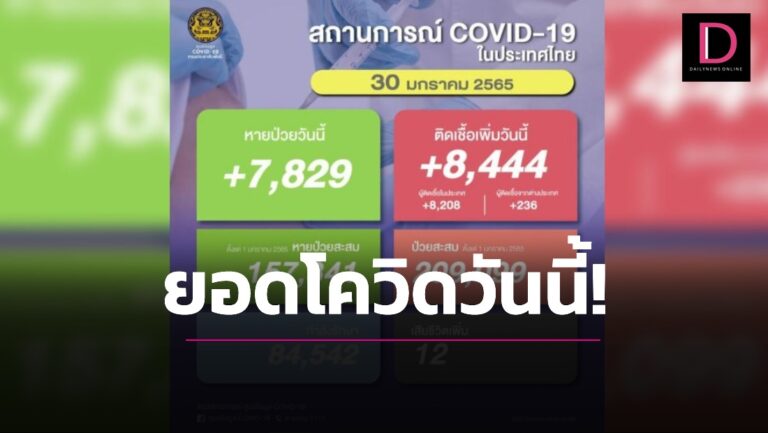 สถานการณ์แพร่ระบาดของโรคโควิด-19 ประจำวัน ศูนย์บริหารสถานการณ์การแพร่ระบาดของโรคติดเชื้อไวรัสโคโรนา 2019 (ศบค.) รายงานสถานการณ์การระบาดของไวรัสโคโรนา 2019 ล่าสุด วันที่ 30 ม.ค. 65 พบผู้ติดเชื้อโควิด-19 รายใหม่อีก 8,444 ราย จำแนกเป็นผู้ป่วยจากในประเทศ 8,208 ราย ผู้ป่วยมาจากต่างประเทศ 236 ราย ผู้ป่วยสะสม (ตั้งแต่ 1 มกราคม 2565) 209,099 ราย หายป่วยกลับบ้าน 7,829 ราย หายป่วยสะสม(ตั้งแต่ 1 มกราคม 2565) 157,341 ราย กำลังรักษา 84,542 ราย