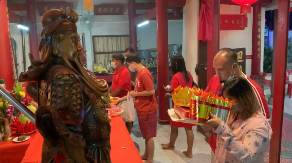 เมื่อวันที่ 31 ม.ค. ภายในศาลเจ้าไหหลำหน้าทอน อำเภอเกาะสมุย จังสุราษฎร์ธานี เสียงประทัดดังปลุกให้ทุกคนรู้ว่าวันตรุษจีนได้เริ่มแล้ว โดยชาวไทยเชื้อสายจีนบนเกาะสมุยต่างนำบุตรหลานเดินทางมาพร้อมเครื่องเซ่นไหว้ ประกอบด้วย หมู เป็ด ไก่ ปลา ผลไม้มงคล ขนม น้ำชา เหล้า ประกอบพิธีเซ่นไหว้สิ่งศักดิ์สิทธิ์ประจำศาลเจ้าพร้อมขอพร โดยทุกคนได้สวมใส่หน้ากากอนามัยซึ่งอยู่ในมาตรการควบคุมการแพร่ระบาดของเชื้อไวรัสโควิด-19
