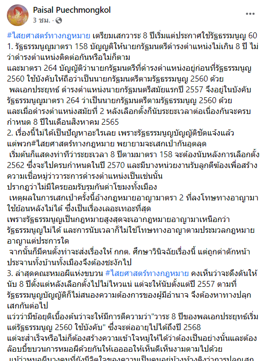 2.เรื่องนี้ไม่ได้เป็นปัญหาอะไรเลย เพราะรัฐธรรมนูญบัญญัติชัดแจ้งแล้ว แต่พวก#ไสยศาสตร์ทางกฎหมาย พยายามจะเสกเป่ากันอุตลุด เริ่มต้นก็แสดงท่าทีว่าระยะเวลา 8 ปีตามมาตรา 158 จะต้องนับหลังการเลือกตั้ง 2562 ซึ่งจะไปครบกำหนดในปี 2570 และมีบางหน่วยงานรับลูกตีฆ้องเพื่อสร้างความเชื่อหมู่ว่าวาระการดำรงตำแหน่งเป็นเช่นนั้น ปรากฏว่าไม่มีใครยอมรับรุมกันด่าโขมงทั้งเมือง