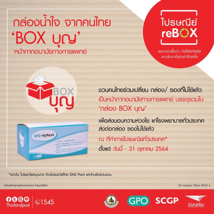 ซึ่งที่ผ่านมาไปรษณีย์ไทยยังได้ดำเนินโครงการ “ไปรษณีย์ reBOX” รวบรวมกล่องพัสดุ และซองกระดาษที่ไม่ใช้แล้วจากคนไทย ส่งต่อให้กับ บริษัท เอสซีจี แพคเกจจิ้ง จำกัด (มหาชน) กว่า 23,500 กิโลกรัม เพื่อแปรสภาพเป็นเตียงกระดาษสำหรับรองรับผู้ป่วยโควิด-19 ส่งให้โรงพยาบาลสนามทั่วประเทศไปเรียบร้อยแล้ว และ ยังได้ร่วมกับองค์การเภสัชกรรม ผลิตหน้ากากอนามัยทางการแพทย์ บรรจุรวมใน “กล่องBOXบุญ” เพื่อส่งมอบให้กับโรงพยาบาล เพื่อกระจายสู่บุคลากรทางการแพทย์ ซึ่งเป็นด่านหน้าที่มีความสำคัญอย่างยิ่ง ในการรับมือกับวิกฤติโควิด-19 อีกด้วย