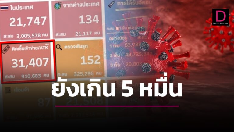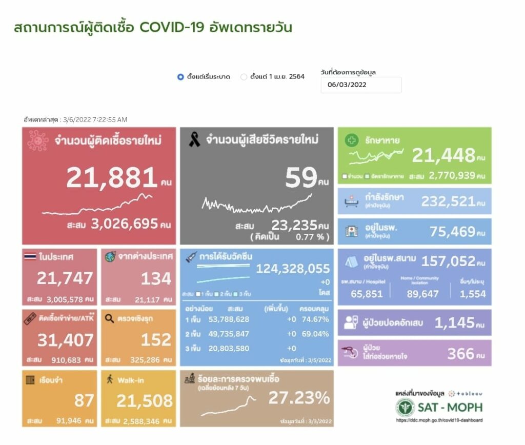 เมื่อวันที่ 6 มี.ค. กรมควบคุมโรค กระทรวงสาธารณสุข เปิดเผยถึงผู้ติดเชื้อรายใหม่ 21,881 คน เป็นการติดเชื้อในประเทศ 21,747 คน นอกจากนี้ยังมีผู้ติดเชื้อเข้าข่าย หรือมีผลบวกจาก ATK อีก 31,407 คน หากนับรวมกับผู้ติดเชื้อยืนยัน วันนี้จะมีผู้ติดเชื้อ 53,288 คน อัตราการตรวจพบเชื้อเฉลี่ยย้อนหลัง 7 วัน 27.23%