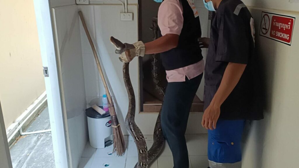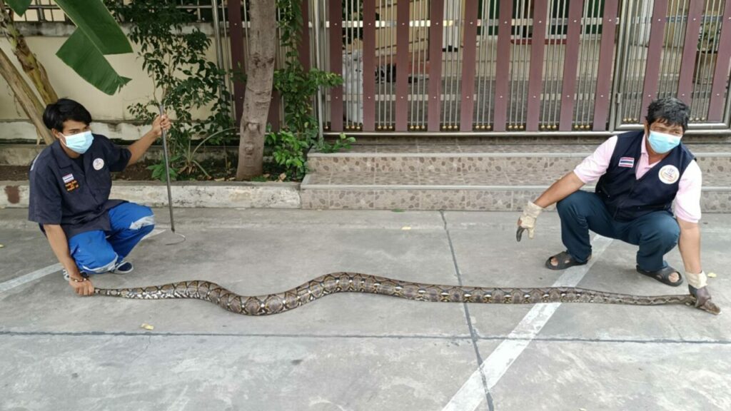 เมื่อวันที่ 10 มี.ค. อาสาสมัครร่วมด้วยช่วยกันฐานคลองหลวงเมืองใหม่ รับแจ้งจากประชาชนขอความช่วยเหลือจับงูตัวขนาดใหญ่ อยู่ภายในห้องน้ำ บ้านเลขที่ 49/373 ต.คลองสอง อ.คลองหลวง จ.ปทุมธานี หลังรับแจ้งจึงประสานงานสมาชิกที่มีความชำนาญพร้อมอุปกรณ์เข้าไปให้ความช่วยเหลือ ที่เกิดเหตุภายในห้องน้ำพบงูตัวขนาดใหญ่นอนขดตัวอยู่กับชักโครก และมีท่าทีขู่ท่าทางดุร้าย เจ้าหน้าที่จึงใช้ไม้อุปกรณ์ทำการจับกุมไว้ได้อย่างปลอดภัย พบเป็นงูเหลือมลำตัวยาวกว่า 3 เมตร น้ำหนักตัวประมาณ 50 กิโลกรัม จึงนำใส่กระสอบเพื่อนำปล่อยแหล่งธรรมชาติห่างไกลบ้านเรือนประชาชน