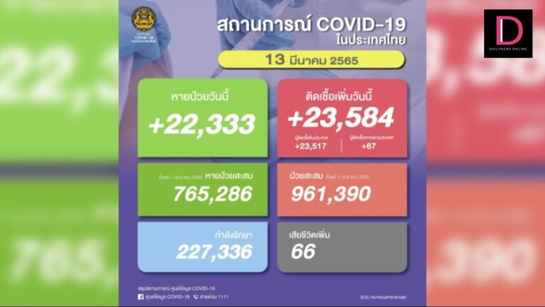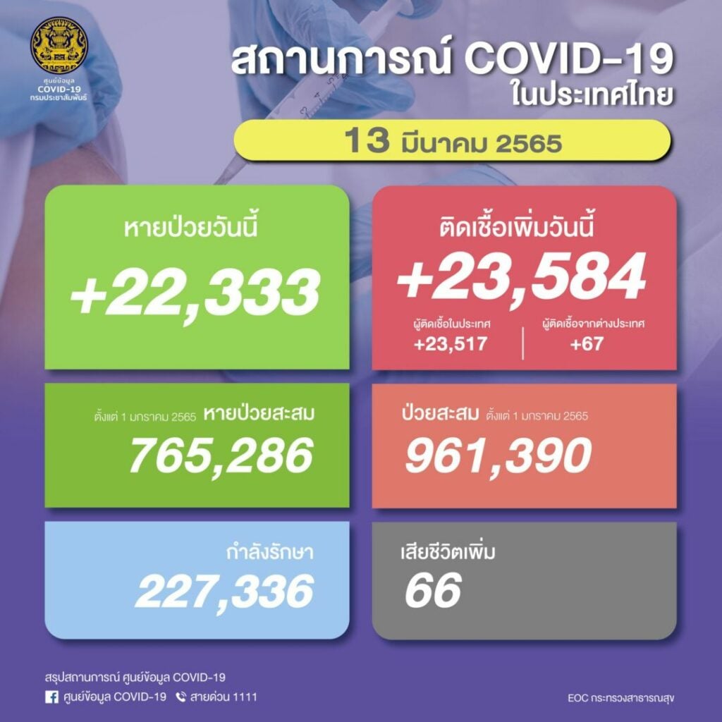 สถานการณ์แพร่ระบาดของโรคโควิด-19 ประจำวัน ศูนย์บริหารสถานการณ์การแพร่ระบาดของโรคติดเชื้อไวรัสโคโรนา 2019 (ศบค.) รายงานสถานการณ์การระบาดของไวรัสโคโรนา 2019 ล่าสุด วันที่ 13 มี.ค. 65 พบผู้ติดเชื้อโควิด-19 รายใหม่อีก 23,584 ราย จำแนกเป็นผู้ป่วยจากในประเทศ 23,517 ราย ผู้ป่วยมาจากต่างประเทศ 67 ราย ผู้ป่วยสะสม (ตั้งแต่ 1 มกราคม 2565) 961,390 ราย หายป่วยกลับบ้าน 22,333 ราย หายป่วยสะสม (ตั้งแต่ 1 มกราคม 2565) 765,286 ราย กำลังรักษา 227,336 ราย