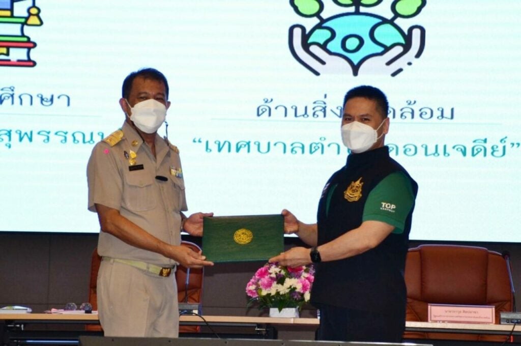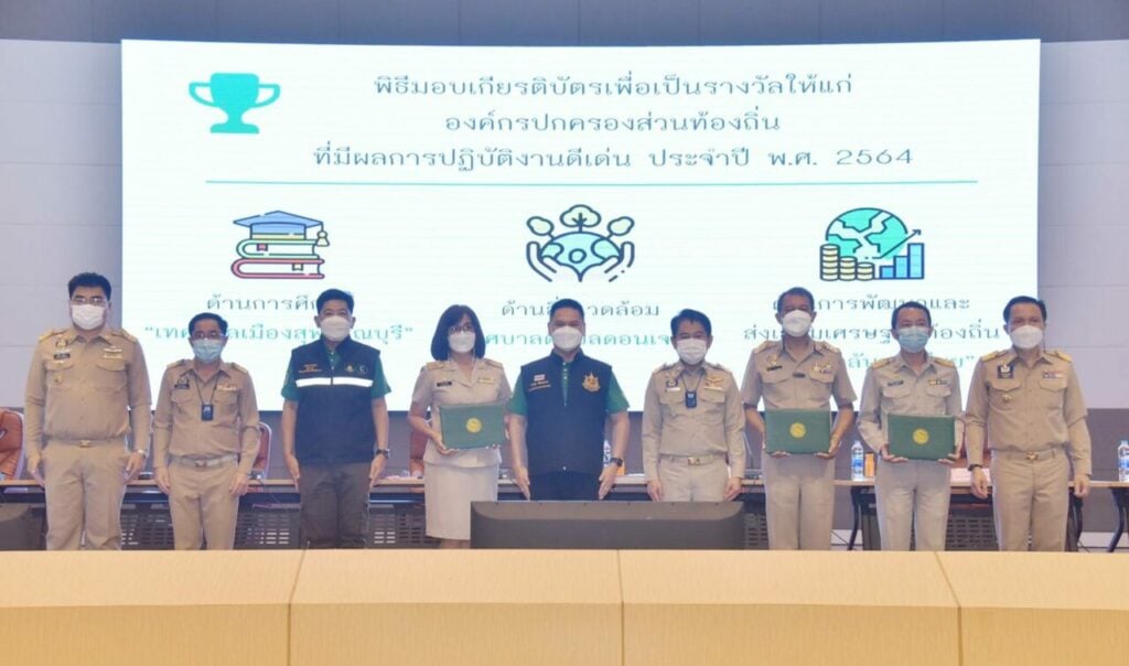 ที่หอประชุมอาชาสีหมอก ศาลากลางจังหวัดสุพรรณบุรี เมื่อวันที่ 22 มี.ค. นายวราวุธ ศิลปอาชา รมว.ทรัพยากรธรรมชาติและสิ่งแวดล้อม เป็นประธานมอบเกียรติบัตรให้กับองค์กรปกครองส่วนท้องถิ่นที่มีผลการปฏิบัติงานดีเด่น ประจำปี พ.ศ. 2564 โดยมีนายณัฐภัทร สุวรรณประทีป ผวจ.สุพรรณบุรี, นายนพฤทธิ์ ศิริโกศล, นายปรีชา ทองคำ, นายชูชีพ พงษ์ไชย รอง ผวจ., นายวัฒนา ยั่งยืน ปลัดจังหวัดสุพรรณบุรี, นายอาคม สุวรรณโน ท้องถิ่นจังหวัดสุพรรณบุรี เข้าร่วม โดยมีผู้นำองค์กรส่วนท้องถิ่นทั้งจังหวัด เข้ารับฟังปัญหาพร้อมกับมอบรางวัล อปท. ที่มีผลการปฏิบัติงานดีเด่น ประจำปี พ.ศ. 2564 จำนวน 8 ด้าน ประกอบด้วย ด้านการศึกษา ด้านการสาธารณสุข ด้านสิ่งแวดล้อม ด้านส่งเสริมศาสนา ศิลปะ วัฒนธรรม และภูมิปัญญาท้องถิ่น ด้านการพัฒนาและส่งเสริมเศรษฐกิจท้องถิ่น ด้านการป้องกันและบรรเทาสาธารณภัย
