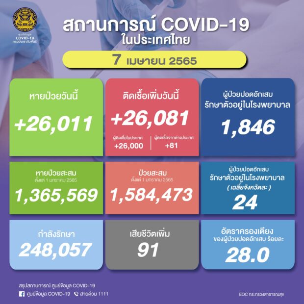 สถานการณ์แพร่ระบาดของโรคโควิด-19 ประจำวัน ศูนย์บริหารสถานการณ์การแพร่ระบาดของโรคติดเชื้อไวรัสโคโรนา 2019 (ศบค.) รายงานสถานการณ์การระบาดของไวรัสโคโรนา 2019 ล่าสุด วันที่ 7 เม.ย. 65 พบผู้ติดเชื้อโควิด-19 รายใหม่อีก 26,081 ราย จำแนกเป็นผู้ป่วยจากในประเทศ 26,000 ราย ผู้ป่วยมาจากต่างประเทศ 81 ราย ผู้ป่วยสะสม (ตั้งแต่ 1 มกราคม 2565) 1,584,473 ราย หายป่วยกลับบ้าน 26,011 ราย หายป่วยสะสม (ตั้งแต่ 1 มกราคม 2565) 1,365,569 ราย กำลังรักษา 248,057 ราย