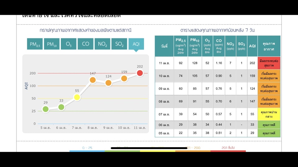 เมื่อตรวจสอบย้อนหลังพบว่า ค่ามลพิษของอุดรธานีสูงขึ้นเร็วมาก จากต้นเดือนเมษายนอยู่ในระดับ “สีฟ้า” หรือดีมาก เพราะช่วงนั้นมีพายุฝนติดต่อกันหลายวัน จากนั้นเริ่มมีการสะสมของฝุ่นละออง และหมอกควันเพิ่มมากขึ้น จากลมมีกำลังอ่อนและไม่มีฝนตก ทำให้วันที่ 5 เมษายน ก็เริ่มขยับสูงขึ้นเป็น 29 AQI (เขียว), 33 AQI (เขียว), 55 (เหลือง), 147 AQI (ส้ม), 124 AQI (ส้ม), 159 AQI (ส้ม) และวันนี้สูงสุด 202 AQI (แดง) เมื่อครบ 24 ชม. จะมีการคำนวณค่าเฉลี่ยอีกครั้ง
