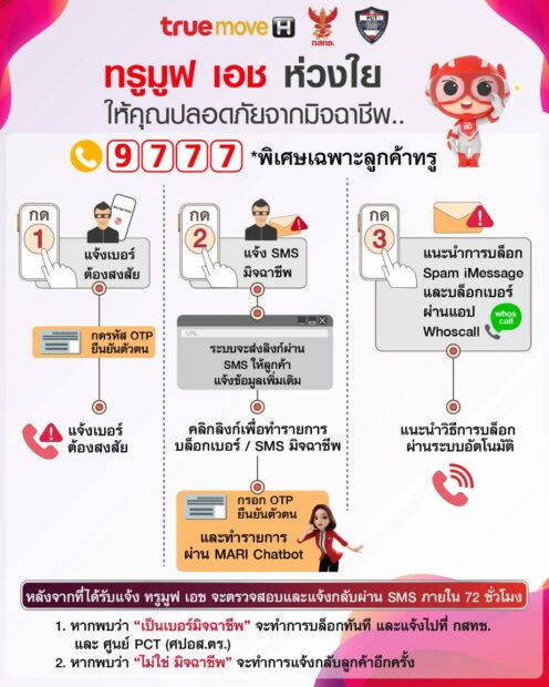 นายณัฐวุฒิ อมรวิวัฒน์ กรรมการผู้จัดการใหญ่ (ร่วม) บมจ. ทรู คอร์ปอเรชั่น กล่าวว่า “กลุ่มทรู ตระหนักถึงภัยอาชญากรรมออนไลน์ที่เพิ่มขึ้นจำนวนมากและมีกลโกงหลากหลายรูปแบบมากยิ่งขึ้น ก่อให้เกิดความรำคาญและสร้างความเดือดร้อนเสียหายแก่ผู้ที่หลงเชื่อตกเป็นเหยื่อของมิจฉาชีพ โดยทรูมูฟ เอช ห่วงใยลูกค้า อยากให้มีความปลอดภัยและมั่นใจในการใช้บริการมากยิ่งขึ้น ซึ่งนอกจากจะให้ความสำคัญในการดูแลปกป้องรักษาข้อมูลส่วนบุคคลของลูกค้าแล้ว เรายังเดินหน้ายกระดับการป้องกันและปราบปรามอาชญากรรมทางเทคโนโลยี ด้วยความตั้งใจแก้ไขปัญหาอย่างเป็นรูปธรรม จึงร่วมมือกับ ศูนย์ปราบปรามอาชญากรรมทางเทคโนโลยีสารสนเทศ สำนักงานตำรวจแห่งชาติ (ศปอส.ตร.) หรือ ศูนย์ PCT และ คณะกรรมการกิจการกระจายเสียง กิจการโทรทัศน์ และกิจการโทรคมนาคมแห่งชาติ (กสทช.) ซึ่งเป็นการทำงานร่วมกันแบบบูรณาการ ตั้งเป้าในการแก้ไขปัญหาให้เป็นไปแบบครบวงจร อันจะนำไปสู่การกวาดล้างจับกุมกลุ่มมิจฉาชีพและดำเนินคดีตามกฎหมาย โดยเปิดฮอตไลน์ 9777 ศูนย์รับเรื่องร้องเรียนเบอร์โทรต้องสงสัยและ SMS มิจฉาชีพ สำหรับลูกค้าทรูมูฟ เอช โทรฟรี ตลอด 24 ชั่วโมง รองรับทั้งภาษาไทยและภาษาอังกฤษ