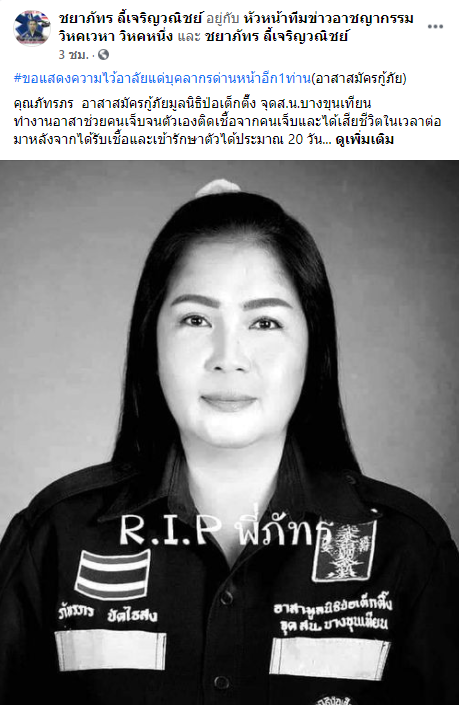 วันที่ 26 ก.ค. ผู้สื่อข่าวรายงานว่า ผู้ใช้เฟซบุ๊ก “ชยาภัทร ลี้เจริญวณิชย์” ได้โพสต์แสดงความอาลัยของเจ้าหน้าที่กู้ภัยมูลนิธิป่อเต๊กตึ๊ง รายหนึ่ง ที่ติดเชื้อโควิดจากการปฏิบัติหน้าที่ด่านหน้า จนเสียชีวิตในที่สุด โดยระบุว่า “ขอแสดงความไว้อาลัยแด่บุคลากรด่านหน้าอีก 1 ท่าน (อาสาสมัครกู้ภัย) คุณภัทรภร อาสาสมัครกู้ภัยมูลนิธิป่อเต็กตึ๊ง จุด สน.บางขุนเทียน ทำงานอาสาช่วยคนเจ็บจนตัวเองติดเชื้อจากคนเจ็บและได้เสียชีวิตในเวลาต่อมา หลังจากได้รับเชื้อและเข้ารักษาตัวได้ประมาณ 20 วัน