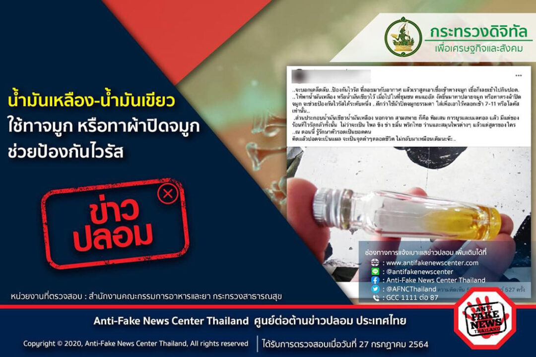 เมื่อวันที่ 27 ก.ค. ที่สำนักงานตำรวจแห่งชาติ (ตร.) พ.ต.อ.กฤษณะ พัฒนเจริญ รองโฆษก ตร. เปิดเผยว่า รัฐบาล สำนักงานตำรวจแห่งชาติ (ตร.) กระทรวงดิจิทัลเพื่อเศรษฐกิจและสังคม มีนโยบายในการสร้างการรับรู้ข่าวสารที่ถูกต้องให้กับพี่น้องประชาชน เพื่อป้องกันการเผยแพร่ข้อมูลข่าวสารที่บิดเบือนหรือข่าวปลอม (Fake News) จากผู้ไม่หวังดี โดยเฉพาะในสื่อสังคมออนไลน์ ศูนย์ต่อต้านข่าวปลอมประเทศไทย ได้ตรวจพบข่าวปลอมเพิ่มเติมอีก 1 กรณี คือกรณีน้ำมันเหลือง-น้ำมันเขียว ใช้ทาจมูกหรือทาผ้าปิดจมูกช่วยป้องกันไวรัสนั้น ศูนย์ต่อต้านข่าวปลอมประเทศไทย ได้ตรวจสอบข้อมูลกับสำนักงานคณะกรรมการอาหารและยา กระทรวงสาธารณสุข แล้ว ยืนยันว่ากรณีดังกล่าวนั้น เป็นข้อมูลเท็จ เนื่องจากไม่ได้มีข้อมูลวิชาการรับรอง อีกทั้งยังอาจก่อให้เกิดการระคายเคืองต่อเยื่อบุบริเวณทางเดินหายใจได้อีกด้วย