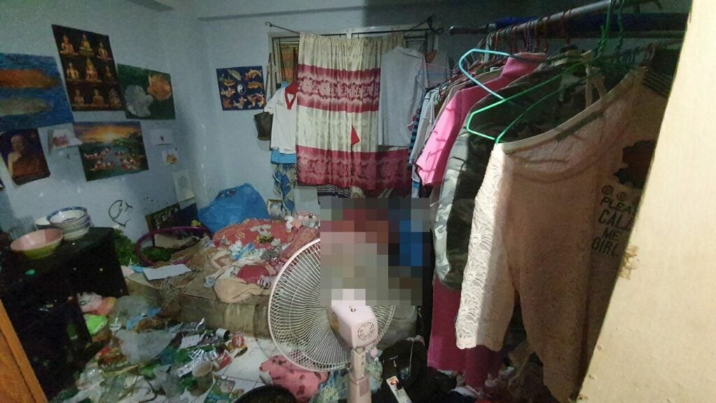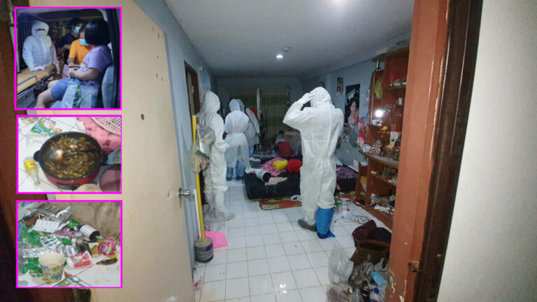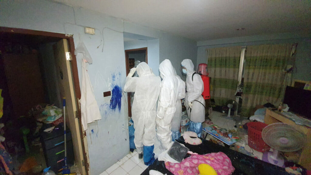 ต่อมา เจ้าหน้าที่จึงสวมชุดป้องกันการติดเชื้อ PPE เข้าไปตรวจสอบภายในห้องพักตามที่รับแจ้ง โดยมีการฉีดพ่นยาฆ่าเชื้อตลอดขณะเข้าตรวจสอบ ภายในห้องพบศพ นางมยุรี (สงวนนามสกุล) อายุ 43 ปี สภาพนอนเสียชีวิตอยู่บนที่นอน ภายในห้องรก มีข้าวของวางกระจายเต็มห้อง ปลายเท้าพบกระทะไฟฟ้าต้มสมุนไพร ใกล้กันพบห่อยาหลากหลายชนิด ทั้งยาแก้ไอ ยาแก้อักเสบ ยาแก้ปวดอย่างแรง และยาอื่น ๆ อีกหลายห่อวางกองอยู่ รวมทั้งถ้วยชาม ลักษณะคล้ายผู้เสียชีวิตน่าจะรู้ตัวว่าตัวเองติดโควิด พยายามหายากินและสูดดมไอร้อนสมุนไพรต้ม กักตัวอยู่ในห้องโดยให้ลูกสาวออกมานอนที่ด้านนอกซึ่งเป็นห้องรับแขก เจ้าหน้าที่จึงฉีดพ่นยาฆ่าเชื้อก่อนนำร่างผู้เสียชีวิตบรรจุลงในถุงซิปล็อก 3 ชั้น ส่งชันสูตรที่สถานบันนิติเวช
