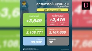 ยอด ‘โควิด-19’ วันนี้ พบเสียชีวิตเพิ่มอีก 32 ศพ ขณะที่พบผู้ติดเชื้อใหม่ 2,476 ราย ส่งสัญญาณดีเริ่มลดลงรายวัน ส่วนผู้หายป่วยมี 3,649 ราย ขณะที่ผู้ป่วยยืนยันสะสมรวม 2,167,666 ราย