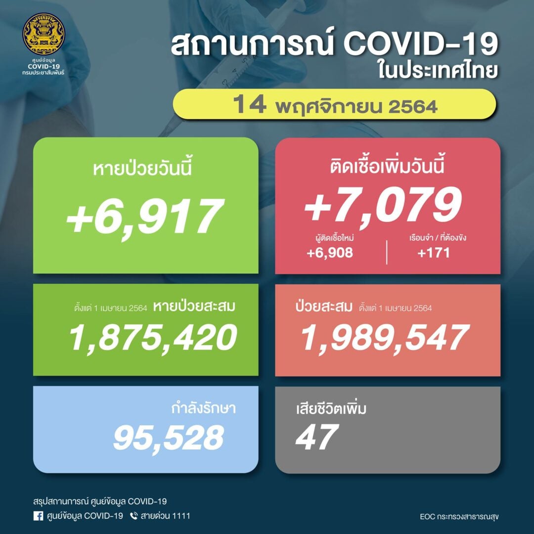 ยอด ‘โควิด-19’ วันนี้ พบเสียชีวิตเพิ่มอีก 47 ราย ขณะที่พบผู้ติดเชื้อใหม่เพิ่มอีก 7,079 ราย ผู้ป่วยยืนยันสะสม 1,989,547 ราย