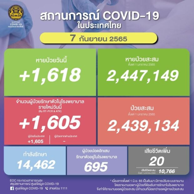 ยอด ‘โควิด-19’ วันนี้ พบเสียชีวิตเพิ่มอีก 20 ราย ขณะที่มีจำนวนผู้ป่วยรักษาตัวใน รพ.รายใหม่ 1,605 ราย กำลังรักษา 14,462 ราย