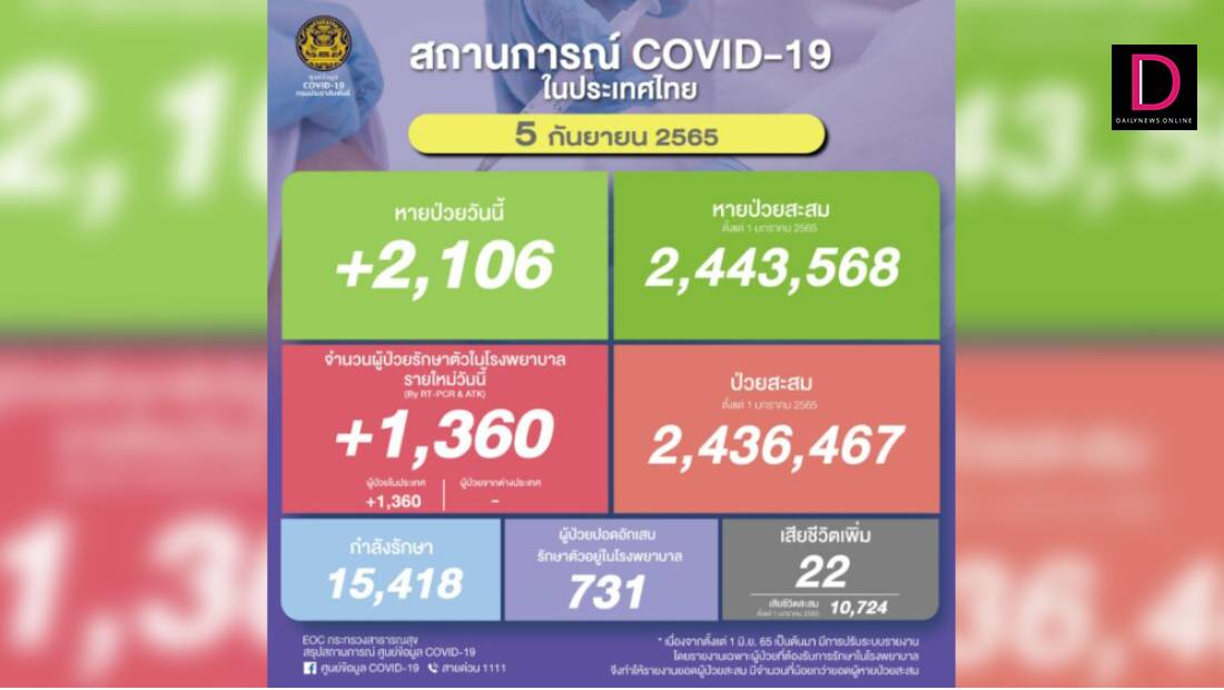 ยอด ‘โควิด-19’ วันนี้ พบเสียชีวิตเพิ่มอีก 22 ราย ขณะที่มีจำนวนผู้ป่วยรักษาตัวใน รพ.รายใหม่ 1,360 ราย กำลังรักษา 15,418 ราย