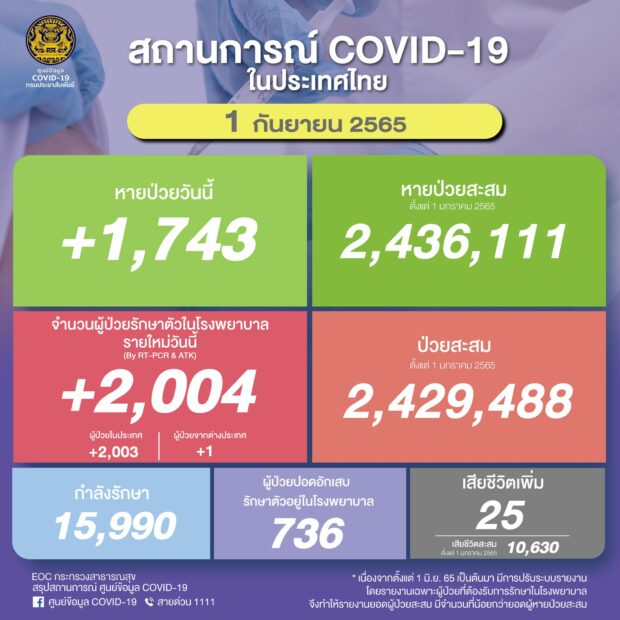 ยอด ‘โควิด-19’ วันนี้ พบเสียชีวิตเพิ่มอีก 25 ราย ขณะที่มีจำนวนผู้ป่วยรักษาตัวใน รพ.รายใหม่ 2,004 ราย กำลังรักษา 15,990 ราย