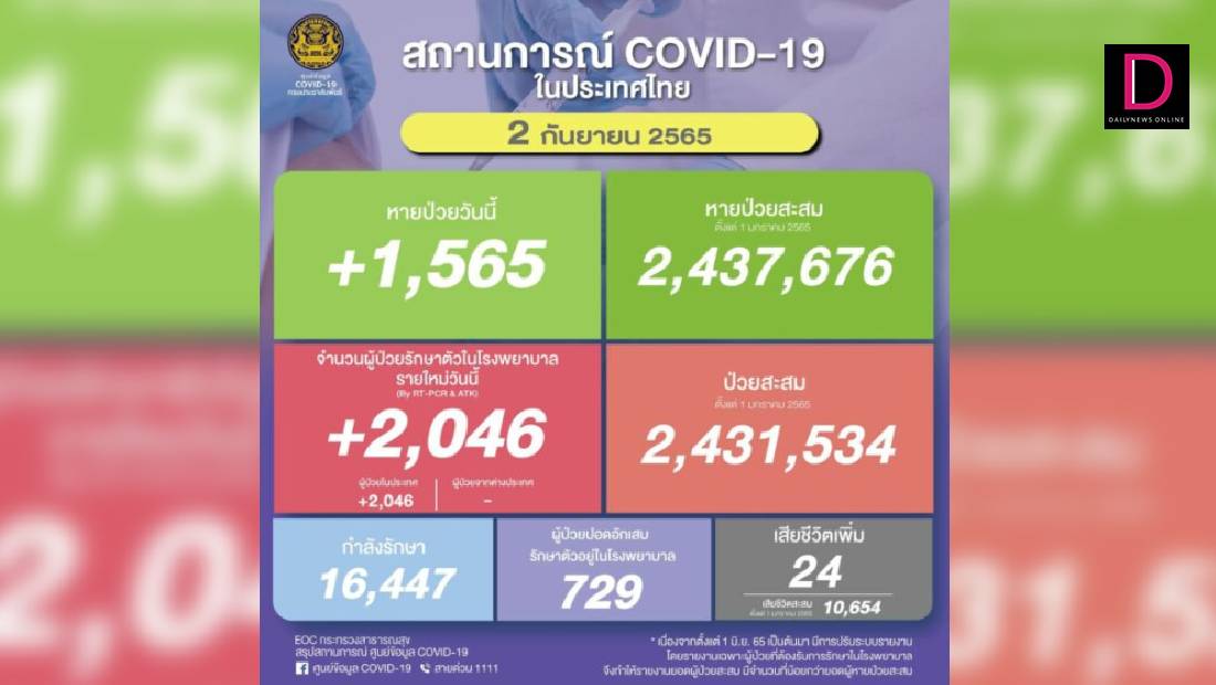 ยอด ‘โควิด-19’ วันนี้ พบเสียชีวิตเพิ่มอีก 24 ราย ขณะที่มีจำนวนผู้ป่วยรักษาตัวใน รพ.รายใหม่ 2,046 ราย กำลังรักษา 16,447 ราย