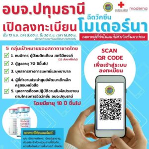 ชาวปทุมธานี เฮอีก อบจ.จัดวัคซีนทางเลือก “โมเดอร์นา” เปิดลงทะเบียน 13 -20 ก.ย.นี้ เงื่อนไข “เป็นคนพื้นที่ – เข็มแรก – พิการ – ป่วยติดเตียง – สูงวัย 70 ปีขึ้น – ครู – ดูแลเด็กเล็ก – ด่านหน้า”