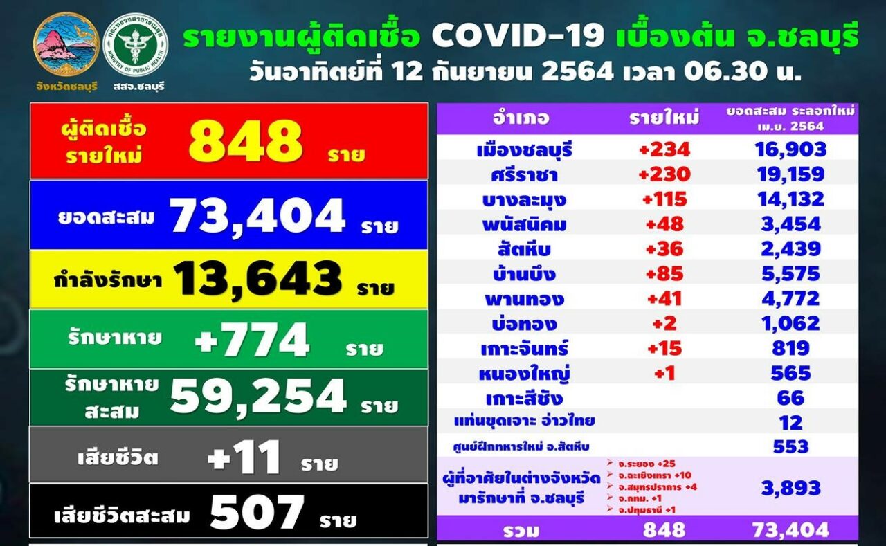 สสจ.ชลบุรี รายงานผู้ติดเชื้อโควิด-19 รายใหม่ วันนี้ จำนวน 848 ราย เสียชีวิต 11 ราย