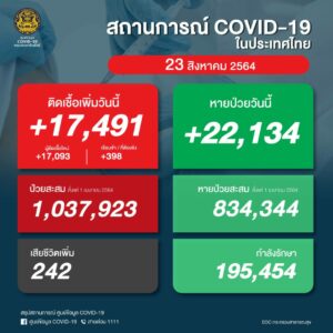 โควิดไทยติดเชื้อใหม่17,491ราย ดับ242ราย หายป่วย22,134ราย