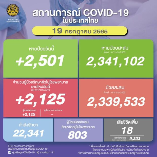 ยอด ‘โควิด-19’ วันนี้ พบเสียชีวิตเพิ่มอีก 18 ราย ขณะที่มีจำนวนผู้ป่วยรักษาตัวใน รพ.รายใหม่ 2,125 ราย กำลังรักษา 22,341 ราย