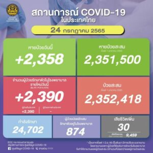ยอด ‘โควิด-19’ วันนี้ พบเสียชีวิตเพิ่มอีก 30 ราย ขณะที่มีจำนวนผู้ป่วยรักษาตัวใน รพ.รายใหม่ 2,390 ราย กำลังรักษา 24,702 ราย