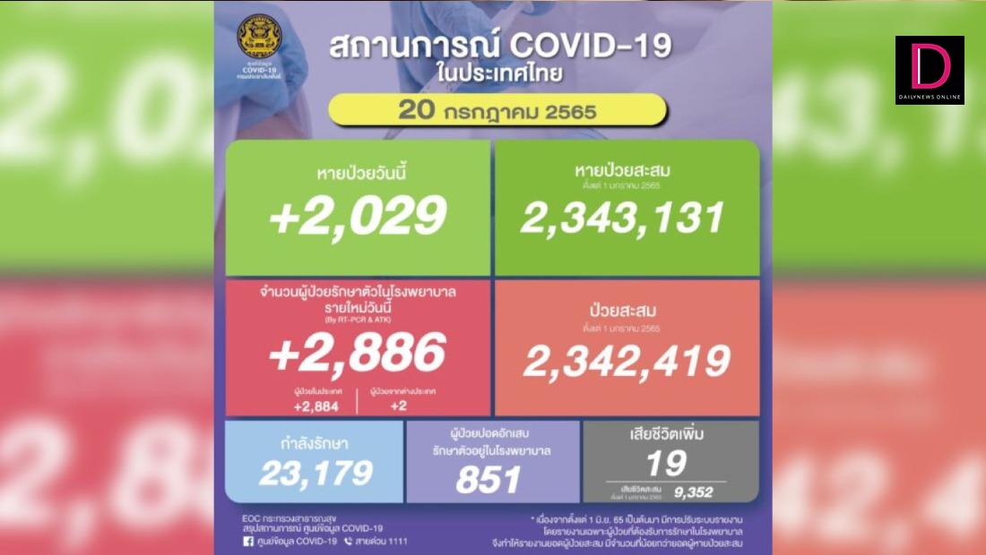 ยอด ‘โควิด-19’ วันนี้น่าสะพรึง! พบเสียชีวิตเพิ่มอีก 19 ศพ ขณะที่มีจำนวนผู้ป่วยรักษาตัวใน รพ.รายใหม่ 2,886 ราย กำลังรักษา 23,179 ราย