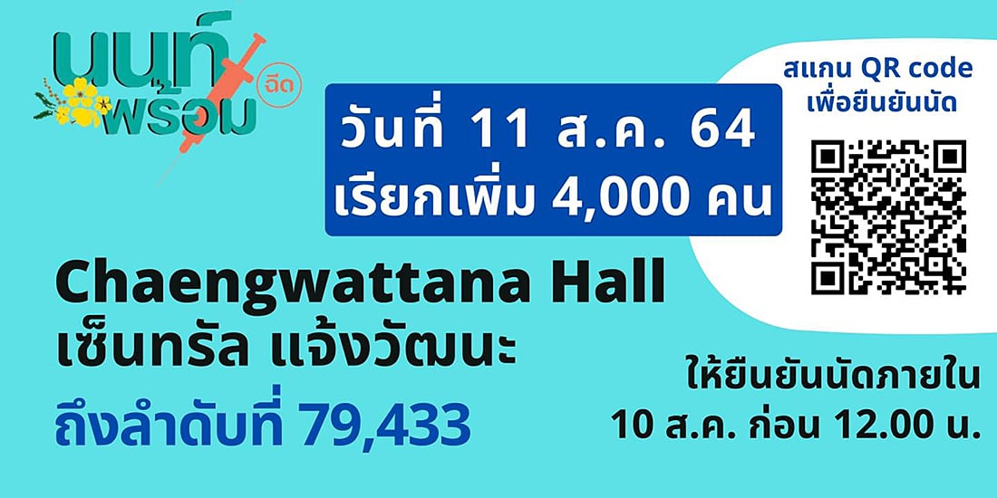 ระบบ นนท์พร้อม แจ้งนัดฉีดวัคซีนอีก 4,000 คน ลำดับสุดท้ายถึง 79,433 ฉีดวันพุธที่ 11 ส.ค.ที่ เซ็นทรัล แจ้งวัฒนะ ยืนยันภายใน 10 ส.ค.ก่อนเที่ยง