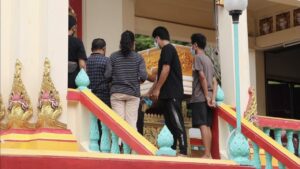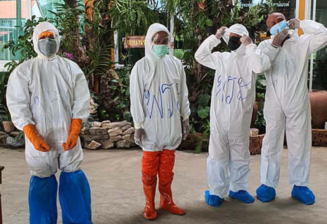 สัปเหร่อวัดหนองวัลย์เปรียง อ.สองพี่น้อง จ.สุพรรณบุรี ติดภารกิจไปช่วยเผาศพวัดอื่นในพื้นที่ เจ้าอาวาส-พระลูกวัด สวมชุด PPE ทำพิธีสงฆ์-เผาศพผู้ป่วยติดโควิดแทน