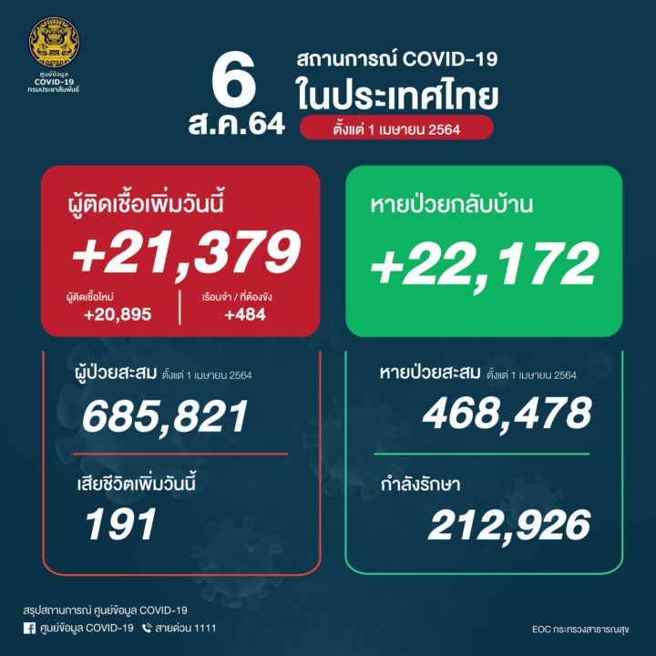 ยอด ‘โควิด-19’ วันนี้ พบเสียชีวิตเพิ่มอีก 191 ราย ขณะที่พบผู้ติดเชื้อใหม่เพิ่มอีก 21,379 ราย ผู้ป่วยยืนยันสะสม 685,821 ราย