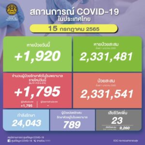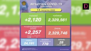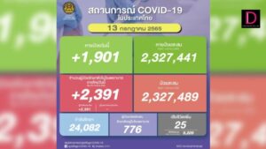 ยอด ‘โควิด-19’ วันนี้ พบเสียชีวิตเพิ่มอีก 22 ราย ขณะที่มีจำนวนผู้ป่วยใหม่วันนี้เพิ่มอีก 2,004 ราย กำลังรักษา 24,557 ราย ติดเชื้อเข้าข่าย ATK อีก 3,385 ราย