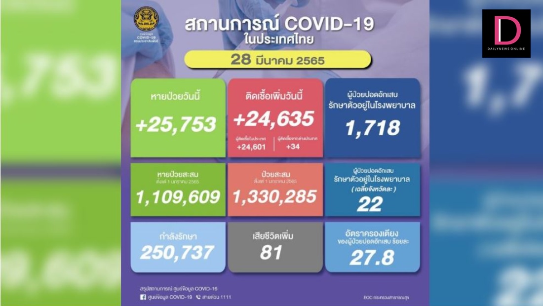 ยอด ‘โควิด-19’ วันนี้ พบเสียชีวิตเพิ่มอีก 81 ศพ ขณะที่พบผู้ติดเชื้อใหม่เพิ่มอีก 24,635 ราย กำลังรักษา 250,737 ราย