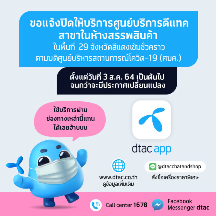 ดีแทคขยายเวลาปิดศูนย์บริการชั่วคราวในพื้นที่สีแดงเข้ม แนะใช้บริการออนไลน์