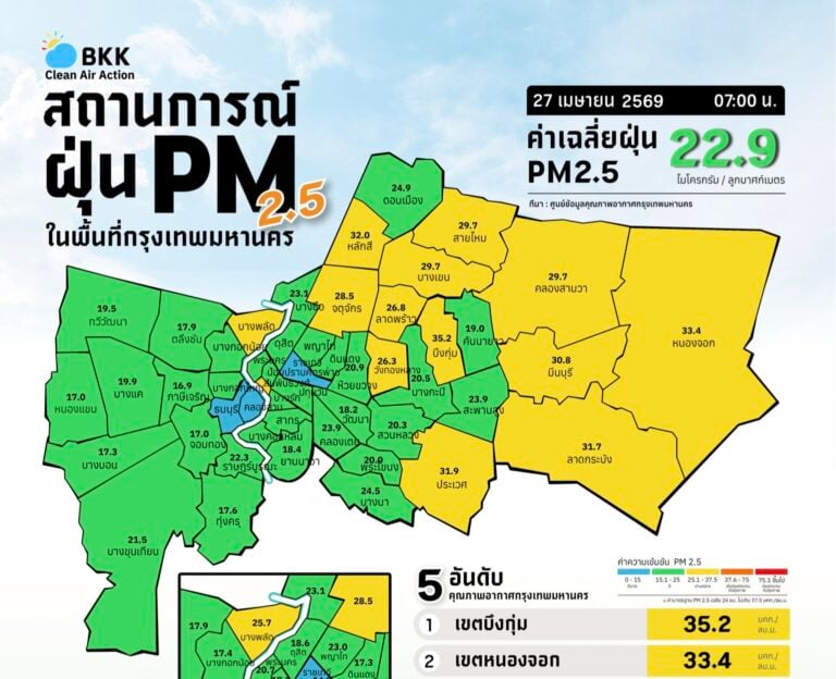 กทม.คุณภาพอากาศดี ฝุ่นไม่เกินมาตรฐานทุกพื้นที่ คาดมีฝนตก