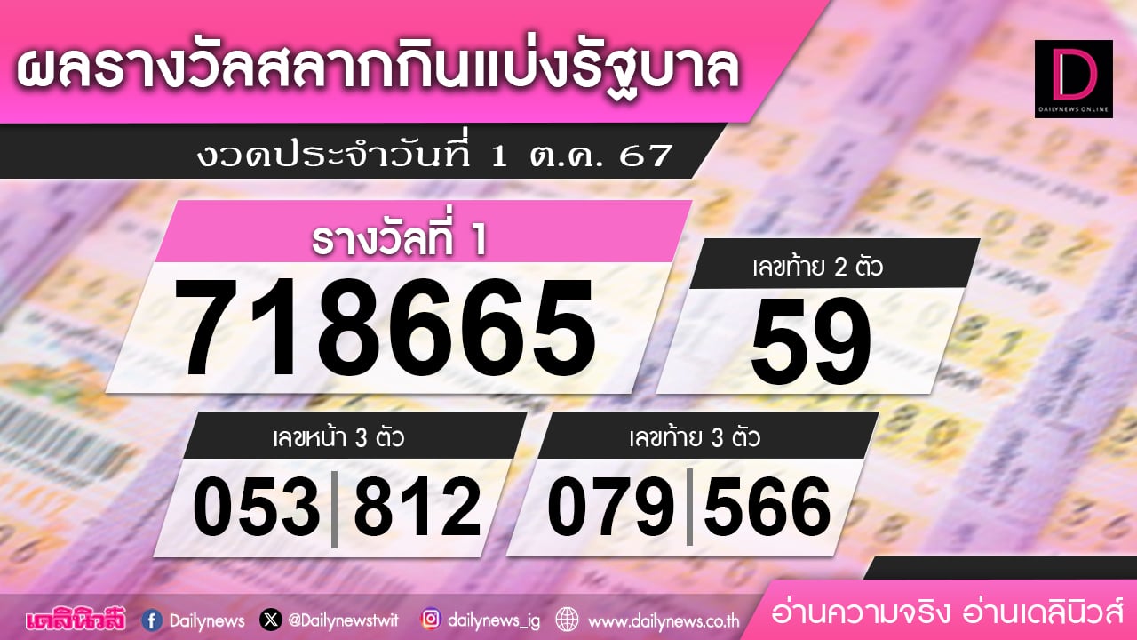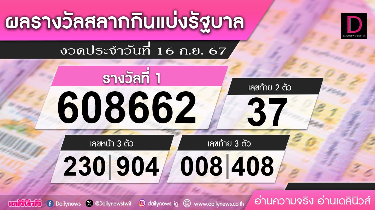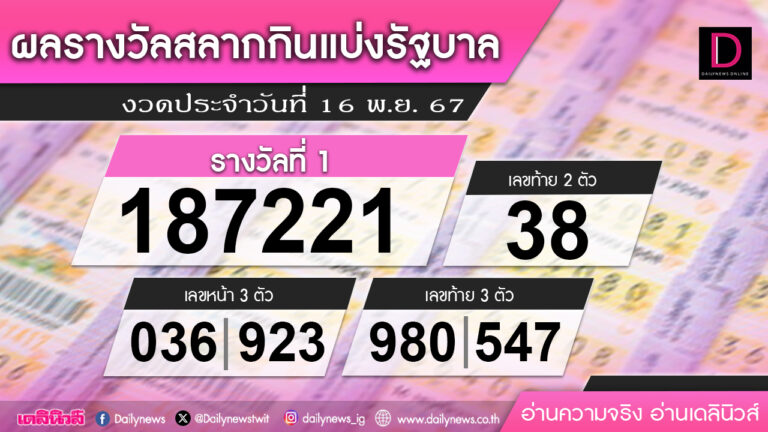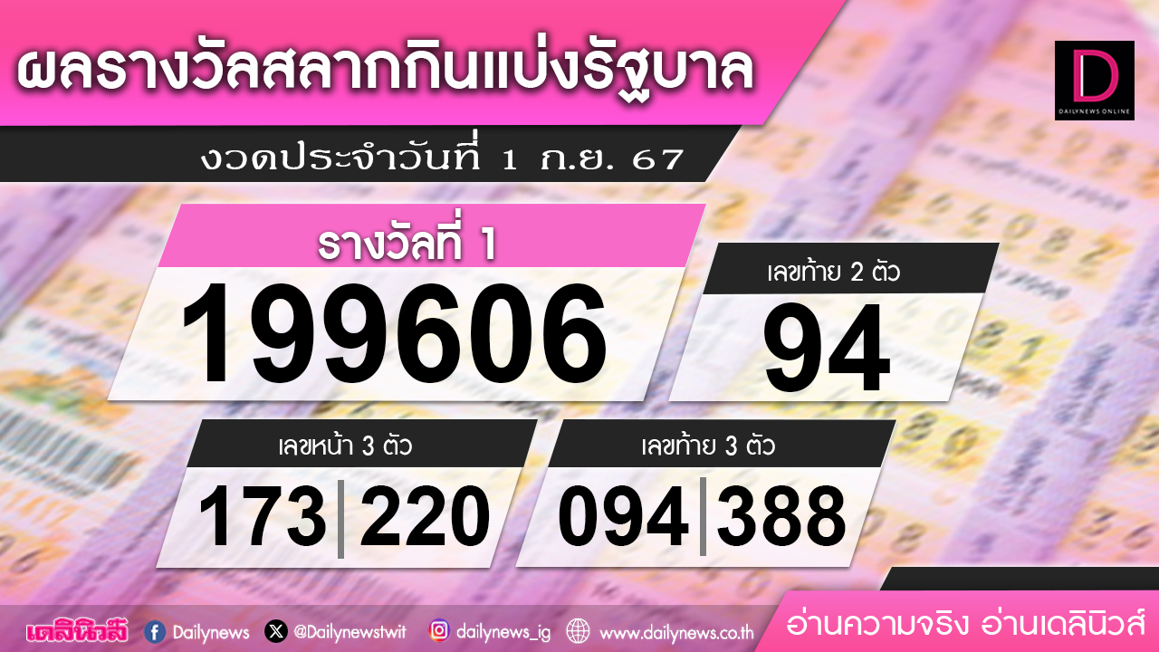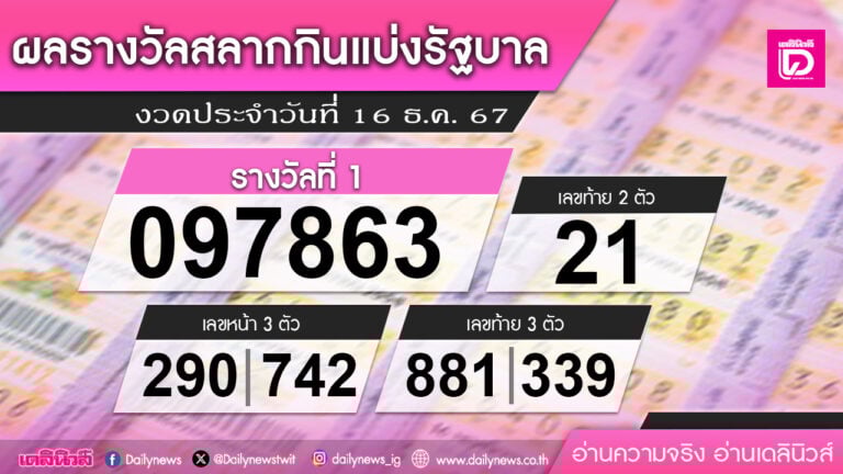ตรวจผลรางวัลสลากกินแบ่งรัฐบาล งวดประจำวันที่ งวด 2 มกราคม 2568 ได้ที่นี่! ตรวจหวย เช็คหวย หวยรัฐบาล ตรวจสลากกินแบ่งรัฐบาล ผลสลากกินแบ่งรัฐบาลตรวจรางวัลที่ 1 สลากกินแบ่งรัฐบาล ลอตเตอรี่ ตรวจลอตเตอรี่ อัพเดทก่อนใครได้ที่ เดลินิวส์