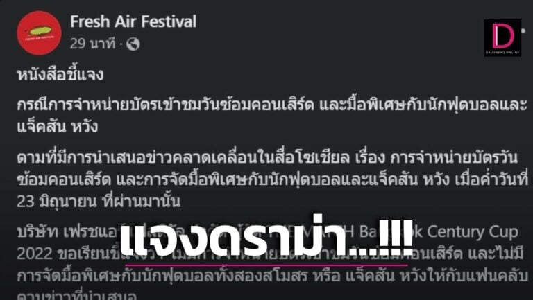 ‘Fresh Air Festival’ แจงดราม่า! ยันไม่มีบัตรชมซ้อมแจ๊คสันหวัง-กินข้าวกับนักเตะ 24 มิถุนายน 2563 0:29 น.
